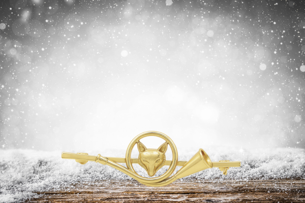 A refined finishing touch: gold-tone French horn motif with engraved fox head and safety-clasp backing—tradition with contemporary styling.